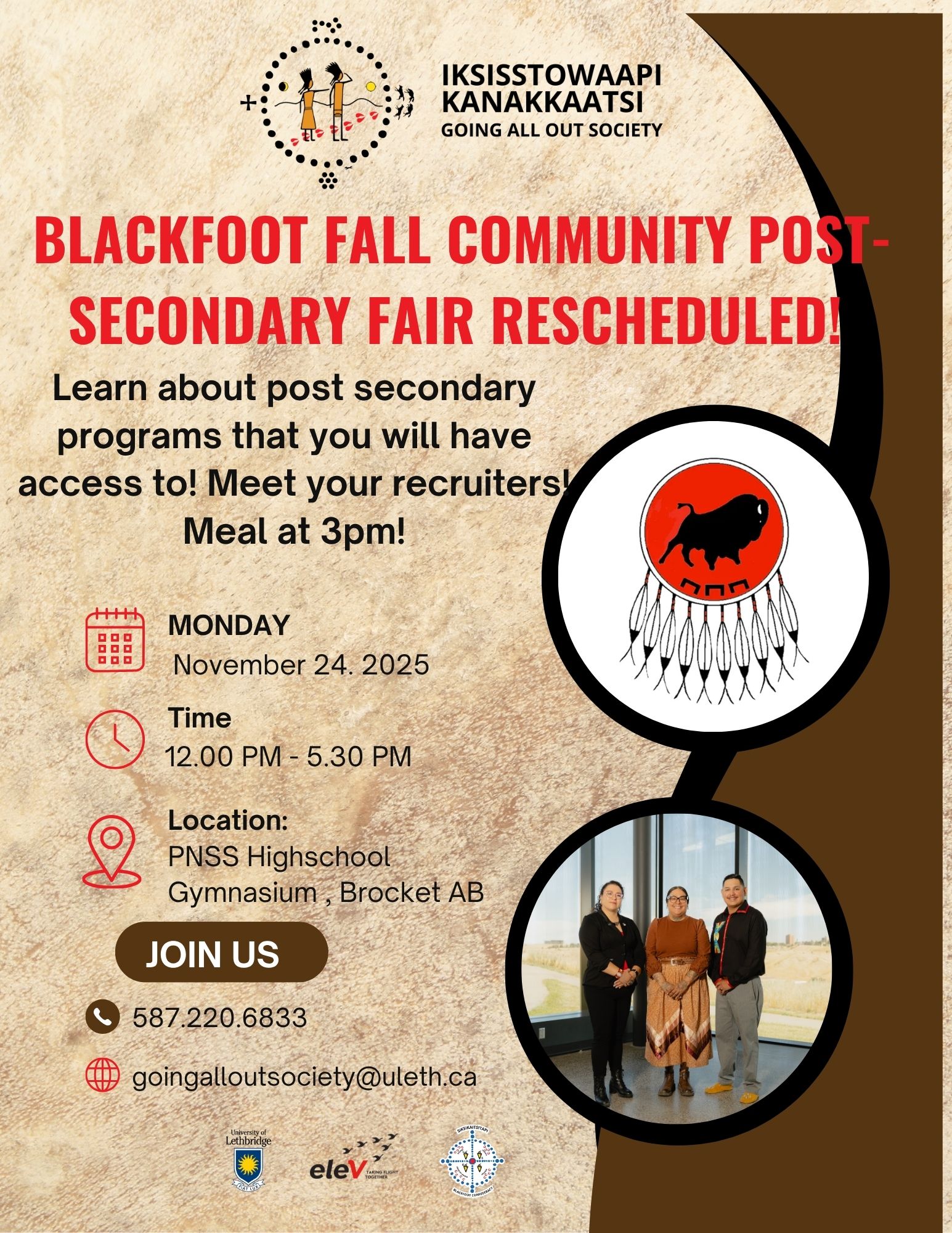 Come explore your future at the Post-Secondary Fair right here in Piikani! Meet representatives from 12 institutions, including: